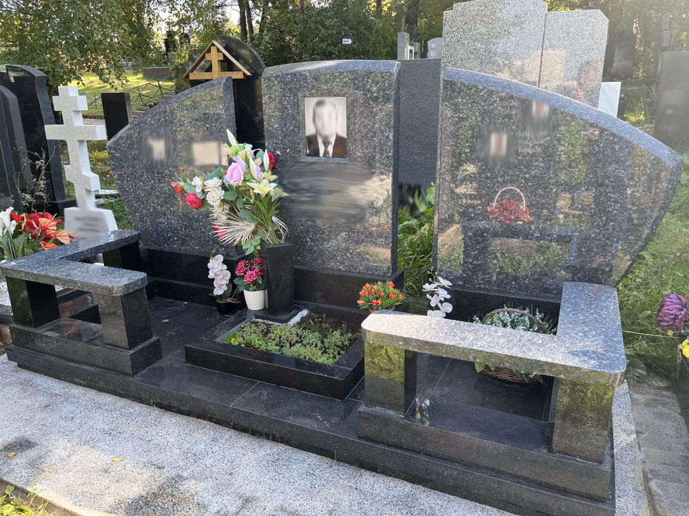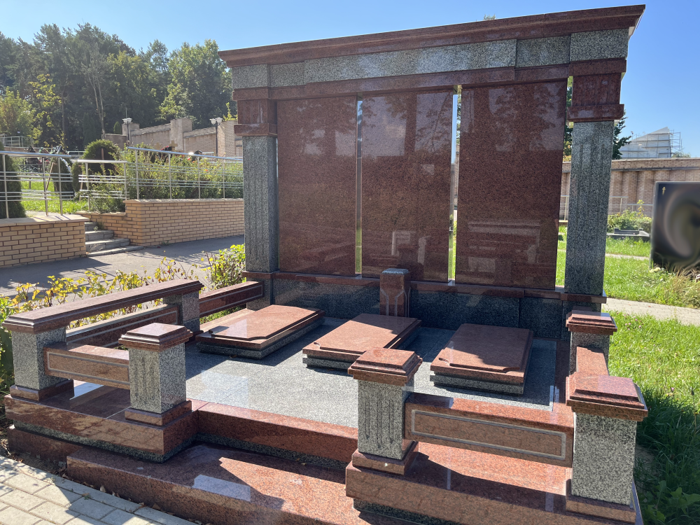 Основа любого современного памятника — натуральный камень. Но если классическое надгробие делают из одной породы, то в современном сочетают две-четыре. Чёрный габбро-диабаз (Карелия) + коричневый Дымовский (Ленинградская область) + красный Капустинский (Украина/аналоги из Индии) — одна из популярных комбинаций. Каждая порода подбирается по совместимости: коэффициенты теплового расширения не должны отличаться более чем на 15%, иначе на стыках появятся трещины.
