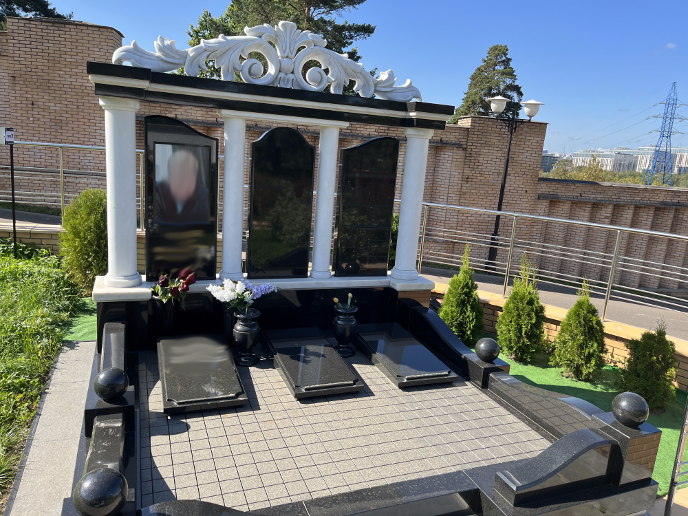 Памятник собирается из 3–7 элементов разного цвета, формы и фактуры. Чёрная стела, красный постамент, серая надгробная плита, белая скульптурная деталь. Каждый элемент — самостоятельный блок, скреплённый с остальными на арматуру и эпоксидный клей. Монтаж занимает 4–6 часов вместо обычных 2–3.